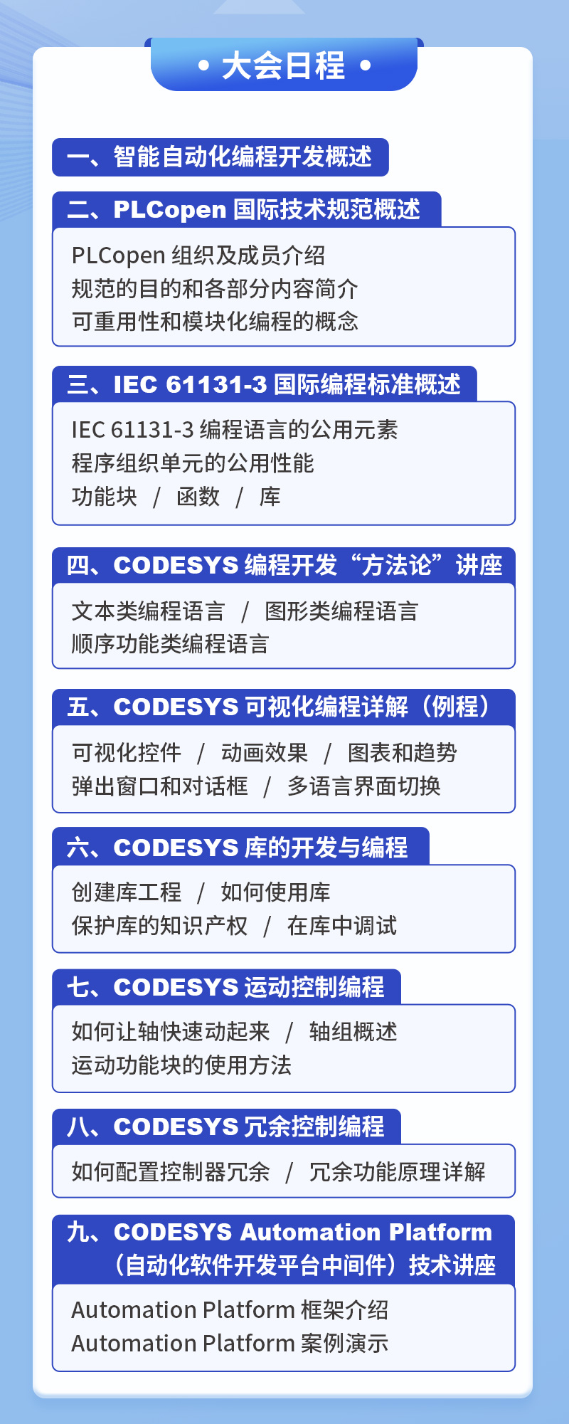 CODESYS 作為重要的工業(yè)控制平臺(tái)性軟件,是“軟件定義未來”方向上不可或缺的一環(huán),對(duì)智能制造和工業(yè)互聯(lián)網(wǎng)的發(fā)展起著重要的支撐作用。為了讓更多國(guó)內(nèi)的企業(yè)、研究機(jī)構(gòu)與高校了解 CODESYS,促進(jìn) CODESYS 軟件在國(guó)內(nèi)的推廣應(yīng)用,CODESYS(中國(guó))將在多個(gè)城市舉辦 CODESYS 編程開發(fā)技術(shù)大會(huì),誠(chéng)摯邀請(qǐng),歡迎報(bào)名。