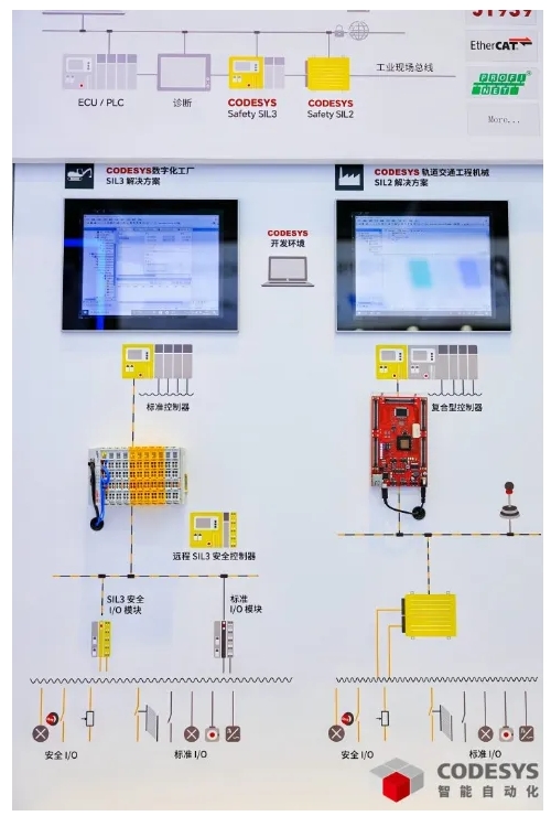 CODESYS Safety SIL 3(功能安全控制) 可用于工廠自動化領(lǐng)域,支持用戶開發(fā)符合 SIL 3 國際標(biāo)準(zhǔn)的安全控制器;CODESYS Safety SIL 2 (功能安全控制)則用于開發(fā)符合 IEC 61508 和 EN 13849 PLd 標(biāo)準(zhǔn)的安全控制器,應(yīng)用于工程機械和特種車輛等領(lǐng)域。同時 CODESYS 支持用戶使用 CODESYS EtherCAT 功能安全模塊開發(fā)實現(xiàn)功能安全目標(biāo)的 Safety 安全控制系統(tǒng)。